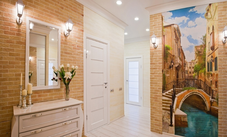 Подобные обои в коридоре достаточно популярны, так как являются достаточно нейтральными, но и декоративными тоже