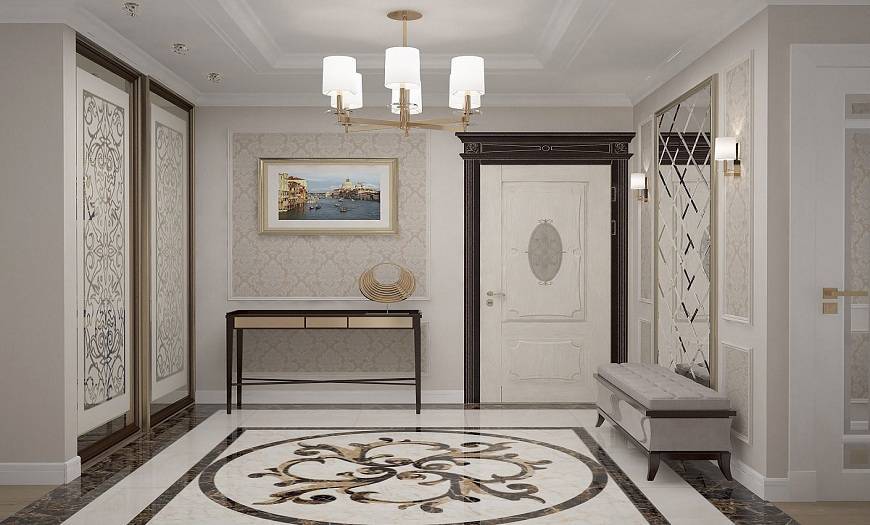 В холле просторной квартиры допустимы крупные гарнитуры, зеркала в полный рост и роскошные осветительные приборы. Ограничения по планировке и оформлению квадратной прихожей отсутствуют. Главное — придерживаться концепции стиля и действовать с учетом рекомендаций дизайнеров.