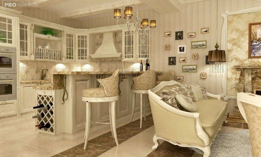На фото кухня в стиле прованс в светлой цветовой гамме. Отделка стен выполнена жидкими обоями и плиткой.