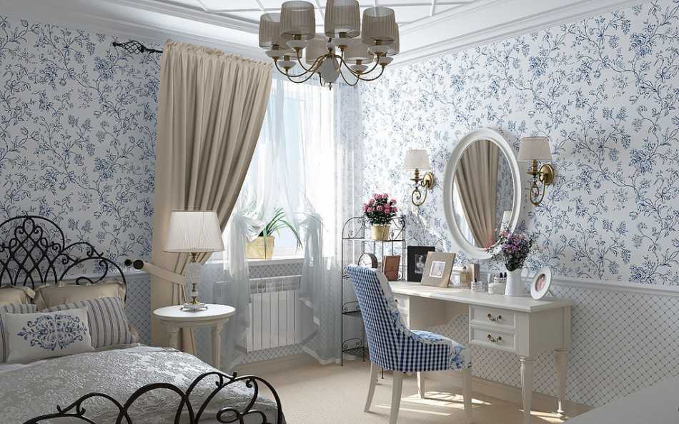 интерьер спальни в стиле прованс с ярким и мелким цветочным рисунком