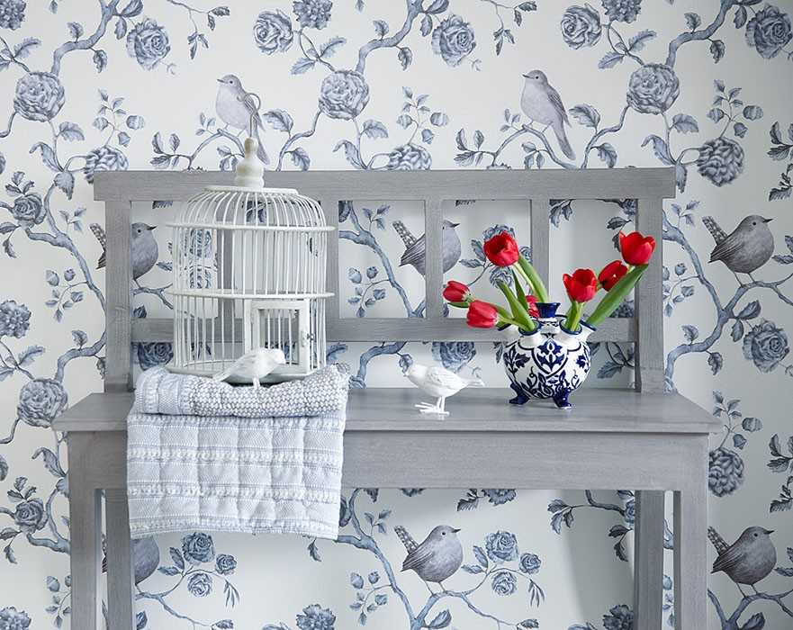 Стены украсят обои с цветами, птицами или ягодами. В комнате будет хорошо смотреться сочетание обоев компаньонов. Удачным решением станет отделка одной из стен фотообоями.