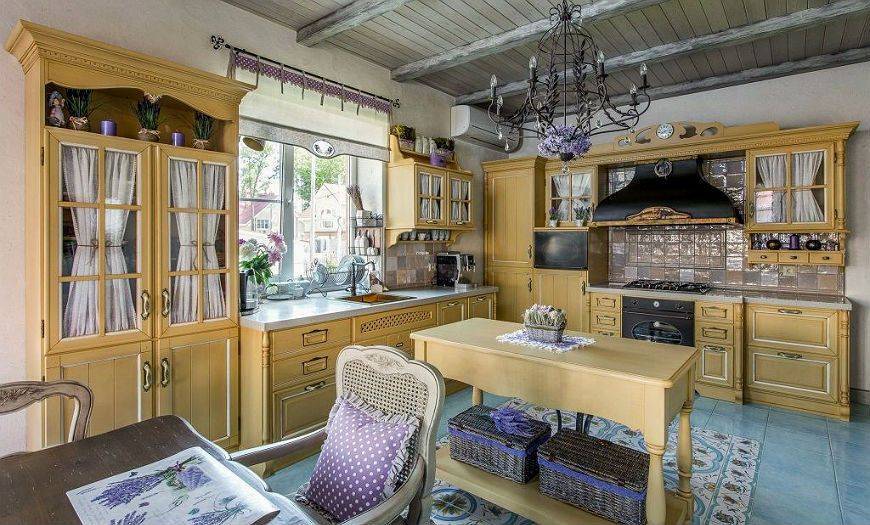 В отделке кухни в стиле прованс предпочтение отдается натуральным материалам.