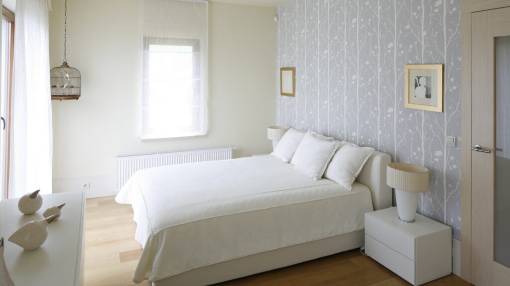 Для этого стиля характерны светлые оттенки в обстановке, поэтому помещение оформляют белыми, светло-бежевыми, нежно-серыми, пепельными полотнами. Допускается покрытие с мелким, едва заметным рисунком неяркого тона.