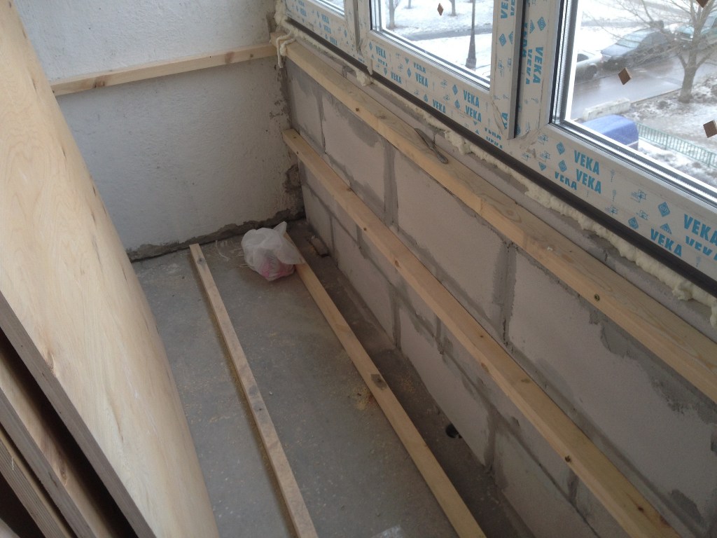 Работа эта несложная, но и небыстрая. Необходимо закрепить обрешётку на множестве небольших поверхностей: откосы окна и двери. С внешней стороны откосов по всему периметру также крепят бруски обрешётки. Отлив окна, за ненадобностью и для придания привлекательного внешнего вида помещению, демонтируют.