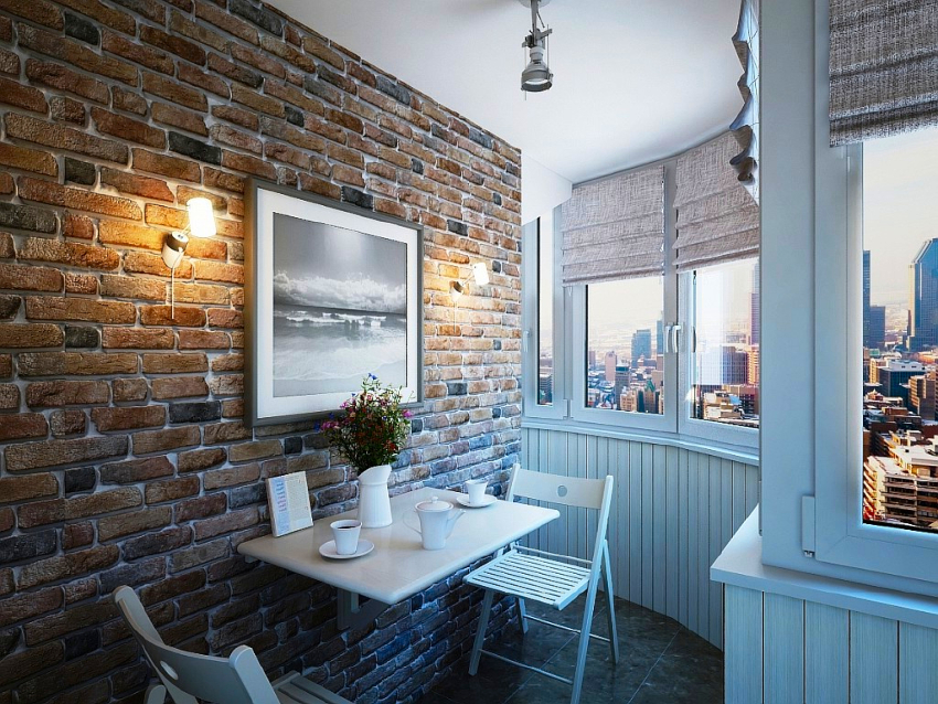 Сегодня особой популярностью пользуется декоративный кирпич. Он придает балкону некой индустриальности, но при этом выглядит натурально и стильно.