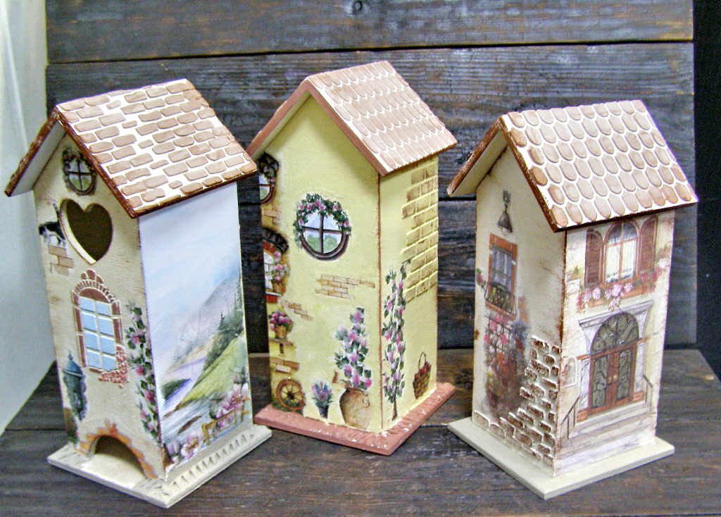 Процесс создания проходит по той же схеме, что и в предыдущих мастер-классах. Основное отличие – это создание трехмерного изображения, для которого при помощи мастихина под края рисунка наносится рельефная паста. Получается, что один рисунок находится в разных плоскостях: центр чуть удален, а края выдвигаются вперед, за пределы поверхности домика.