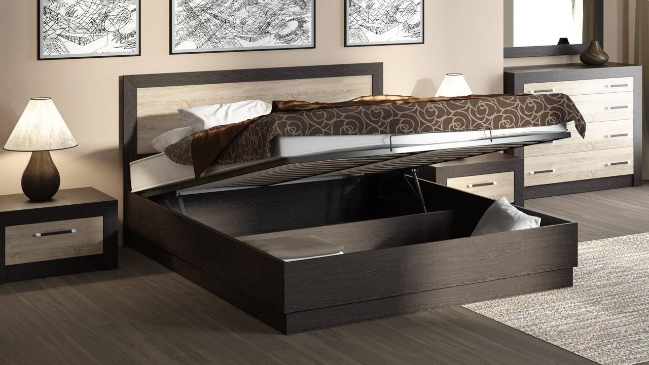 Модели с подъемным механизмом – вытяжными пружинами или баллоном со сжатым газом, которые приподнимая основание, открывают цельный отсек для хранения. Каркас кровати должен быть максимально прочным, чтобы избежать перегрузки и поломки.