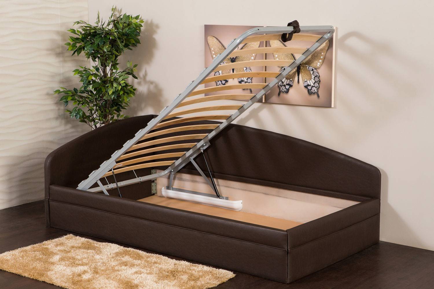 Система имеет два основных преимущества. Во-первых, внешний вид кровати с подъемным механизмом ничем не отличается от обычных моделей. Дизайн остается стильным и безупречным.