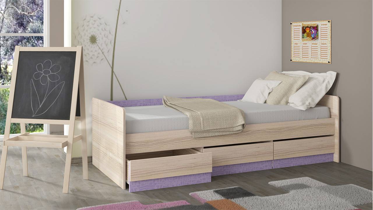 Кровать-тахта с выдвижными ящиками внешне похожа на диван и отлично подходит как для маленьких детей, так и для школьников и подростков. Наличие мягкого дополнительного изголовья создаёт своеобразный уют и помогает малышу бороться с ночными страхами.