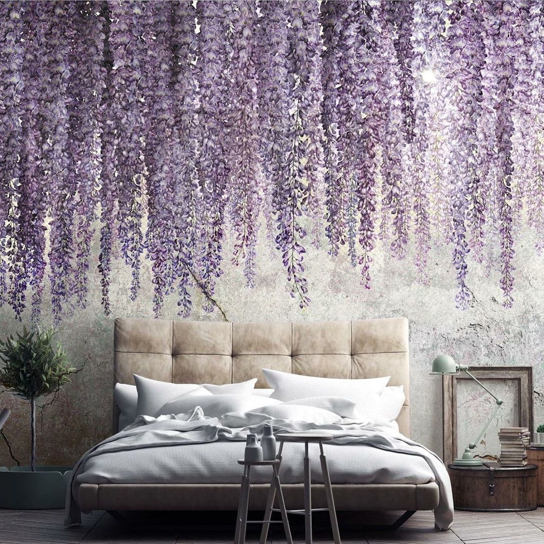 Оклеить обоями под бетон лучше только часть спальни, например, стену у изголовья, смежную с ней или противоположную. Обои в таком случае лучше выбрать либо фактурные, либо с выраженным рисунком, цветными разводами и пр.