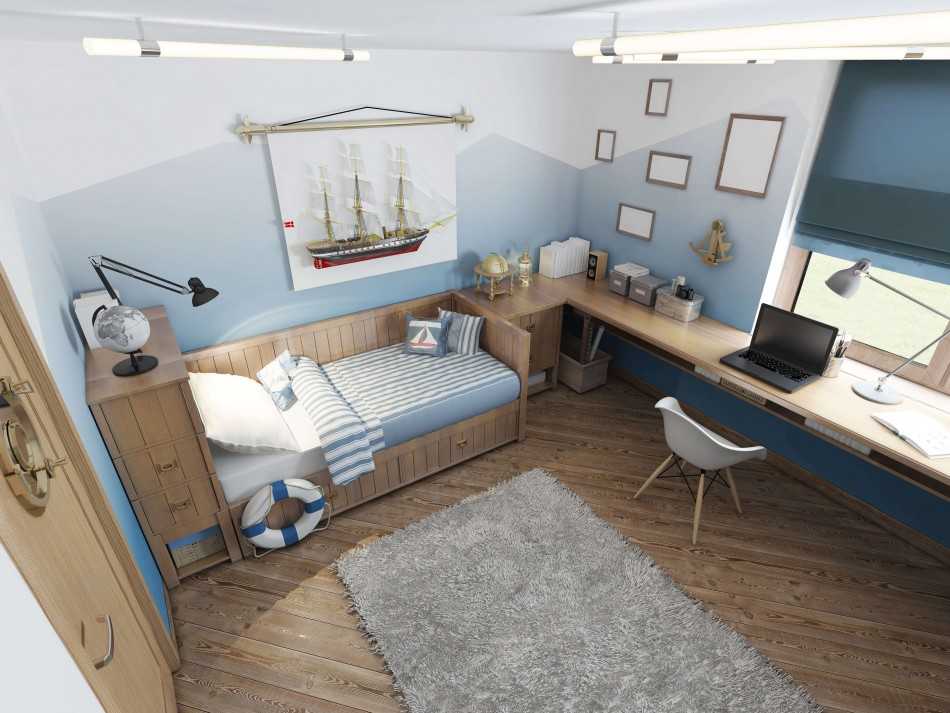 Сформировать дизайн детской комнаты для мальчика одновременно и легче, и тяжелее. Начиная с двух-трехлетнего возраста можно оформлять интерьер в тематическом стиле. Это может быть комната моряка или путешественника, кабина космолета или аэроплана, авто гараж и другое оформление, которое помимо комфорта внесет и развивающий акцент в обстановку.