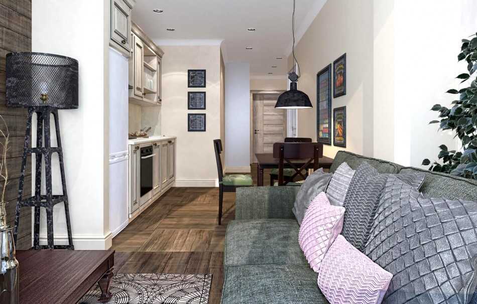 Чаще всего для напольных покрытий используют ламинат, паркет или массивную доску. Если есть кухонная зона – керамическую плитку. В уголке с мягкой мебелью уместно положить под ноги симпатичный ковёр. Для отделки стен выбирают подходящие по стилю обои, художественную штукатурку, фотофрески, фантазийные панели.