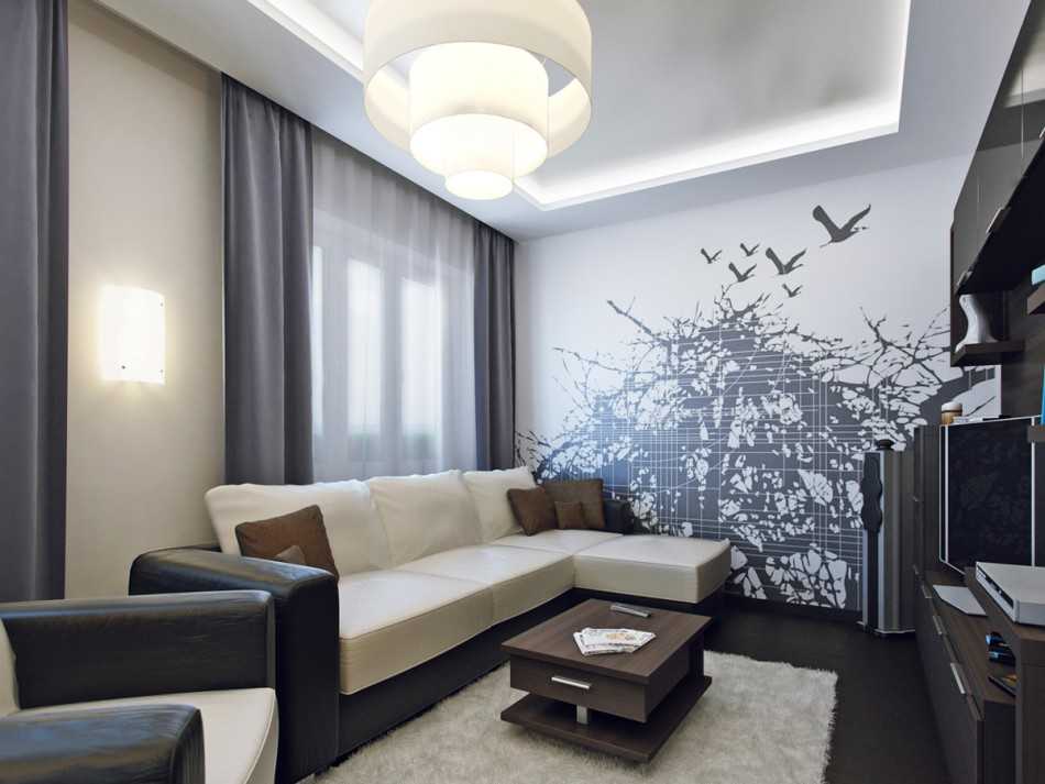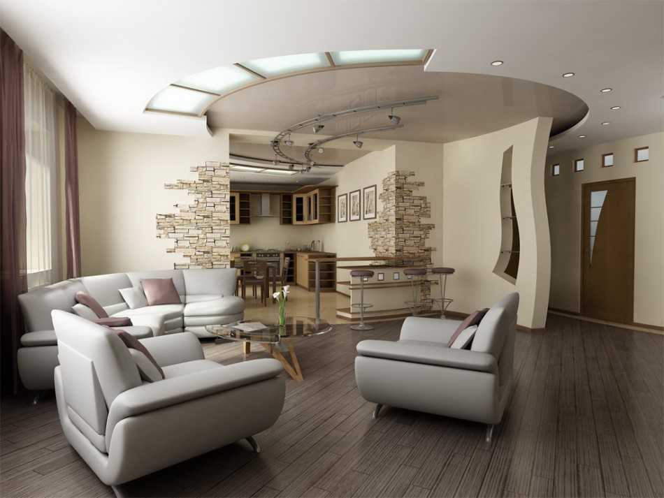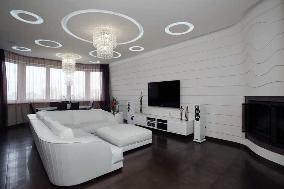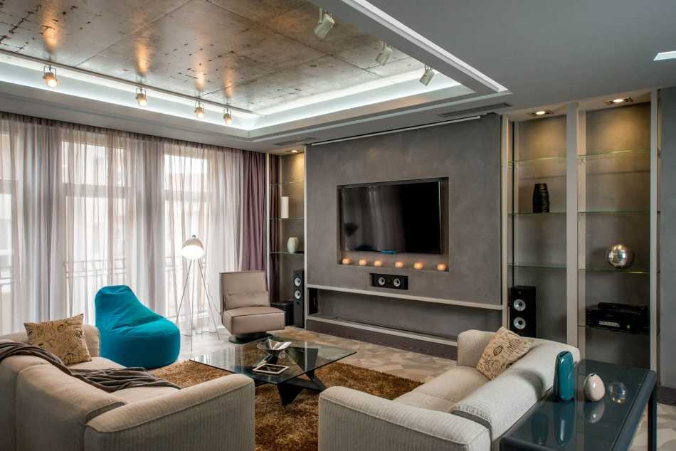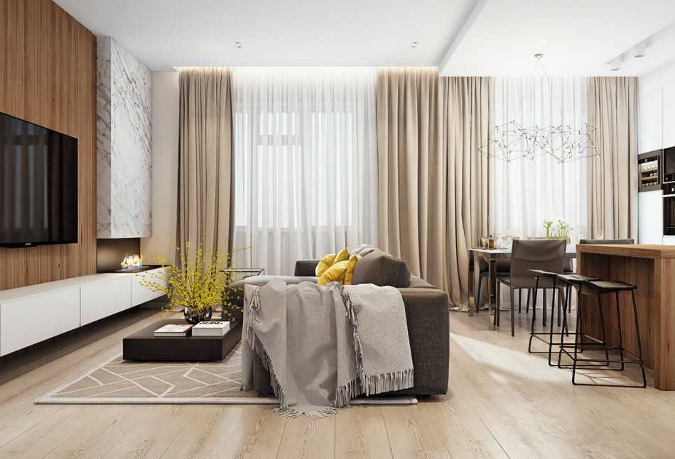 Выбор отделочных материалов зависит от стилистического решения. Использование разных цветов и контрастных фактур помогает зрительно выделить функциональные зоны, придаёт выразительность дизайну гостиной в квартире.