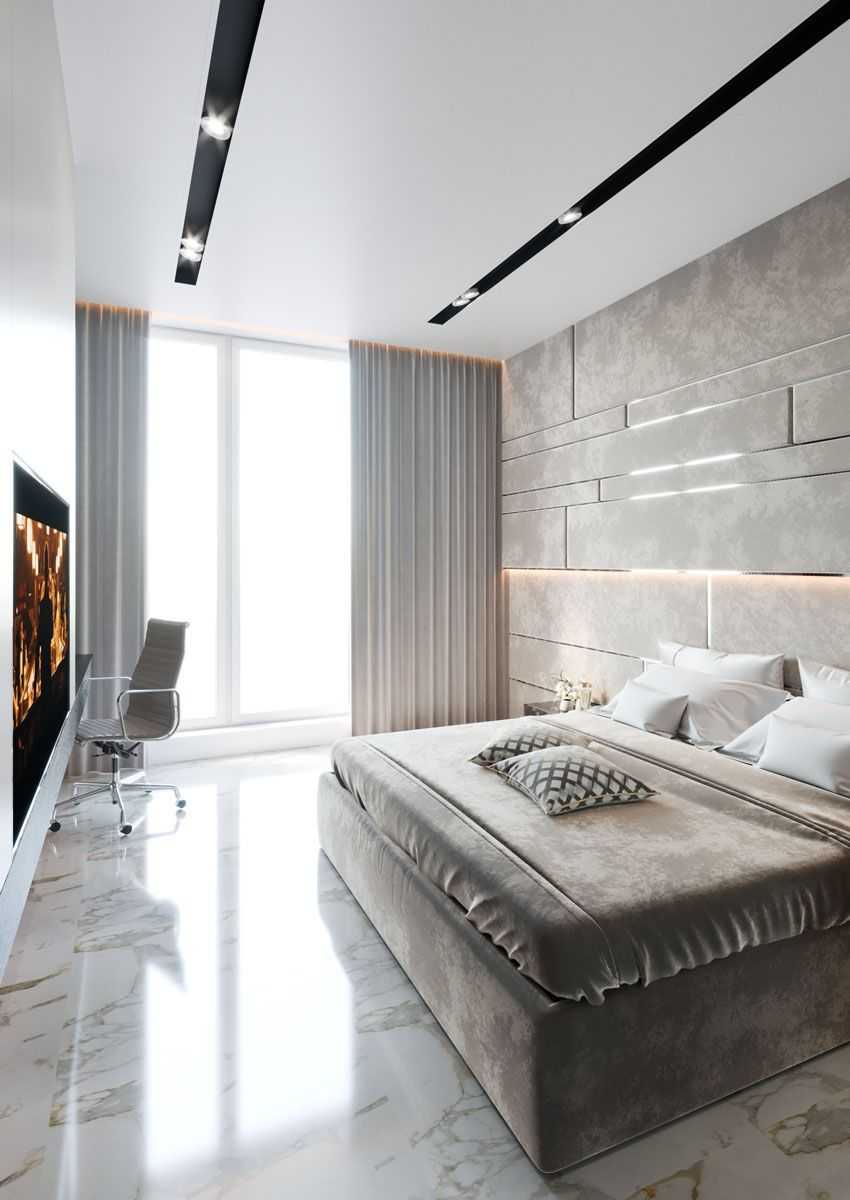 Это концепция для поклонников технических новинок. Обязательные атрибуты такой спальни — большой телевизор с качественной акустической системой, точечные и напольные светильники, неоновая подсветка.