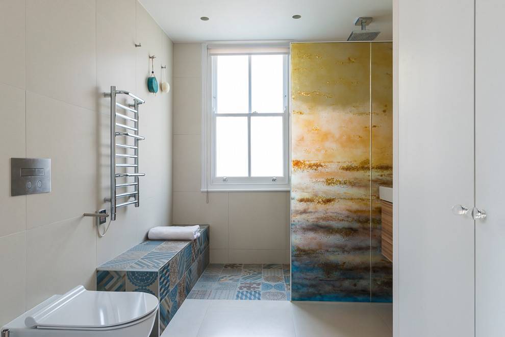 Яркие разноцветные керамические плитки являются тем элементом, который помогает создать в ванной комнате атмосферу праздника и радости.