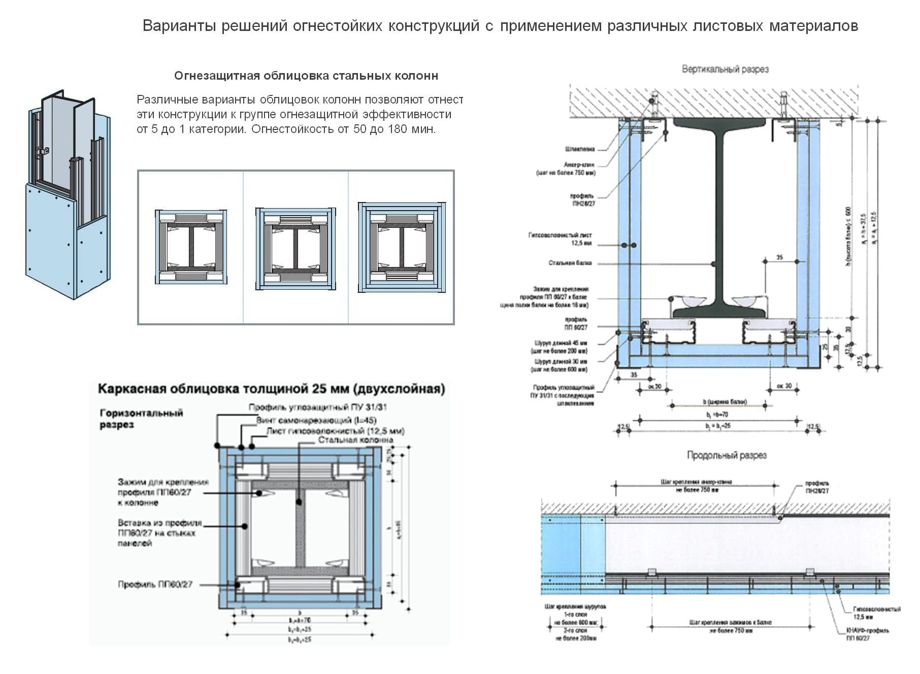 По заверению специалистов этой компании, это далеко не предел огнестойкости при огнезащите металлических конструкций зданий, каркасов сооружений. Так, на основании проведенных расчетов, натурных огневых испытаний ими получены высокие результаты при многослойном монтаже/облицовке панелями «Кнауф-Файерборд»: при толщине 60 мм достигается огнестойкость 120 мин, а при 70 мм – 180 мин; что соотносимо с созданием кирпичной стены/перегородки при гораздо большем расходе материалов, общих затратах на выполнение работ, огромной нагрузке на перекрытия зданий, сооружений.