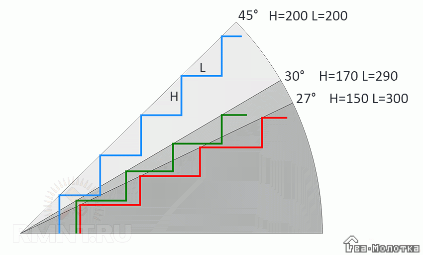 Зависимость высоты и ширины ступени от угла подъема лестницы