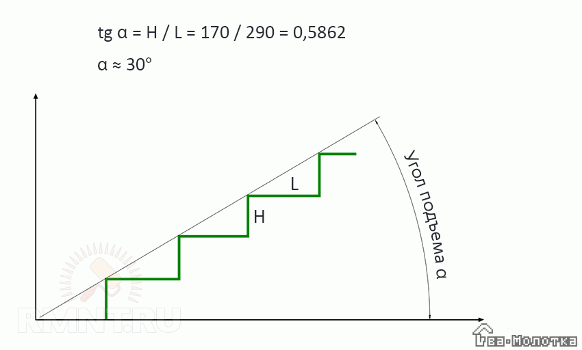Определение угла наклона лестницы по высоте и ширине ступени