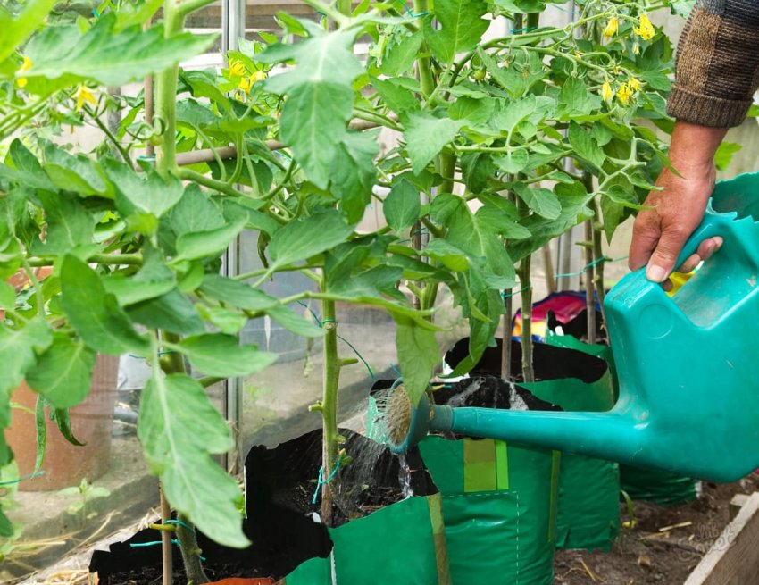 Для полива помидорных кустов 1 л смеси выливают в ведро воды. Брызгать помидоры, чтобы было больше завязи, нужно раствором меньшей концентрации — достаточно взять 100 мл раствора на 2 л воды.