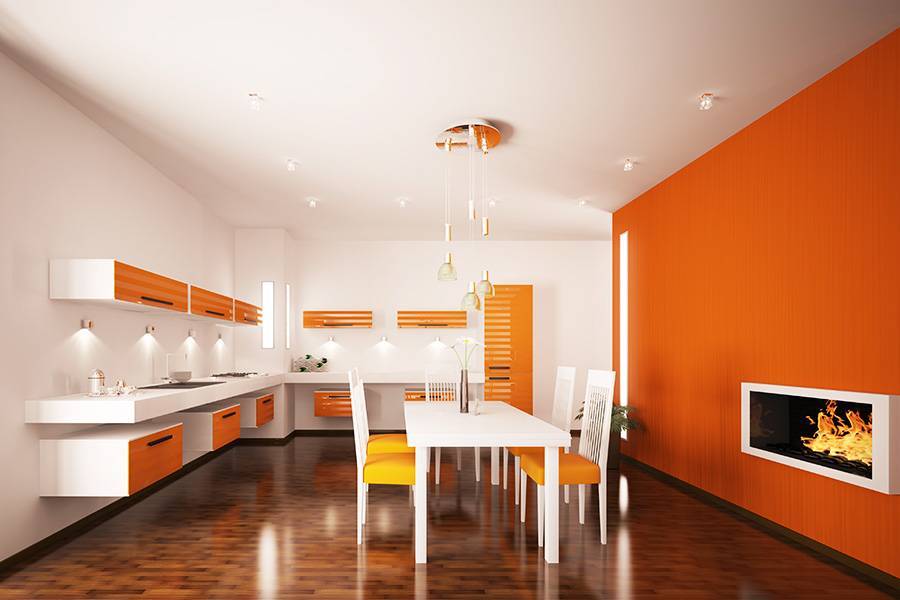 - если же комнату надо сделать визуально шире, то цветом апельсина отделывают несколько стен или хотя бы их части, например, фартук;