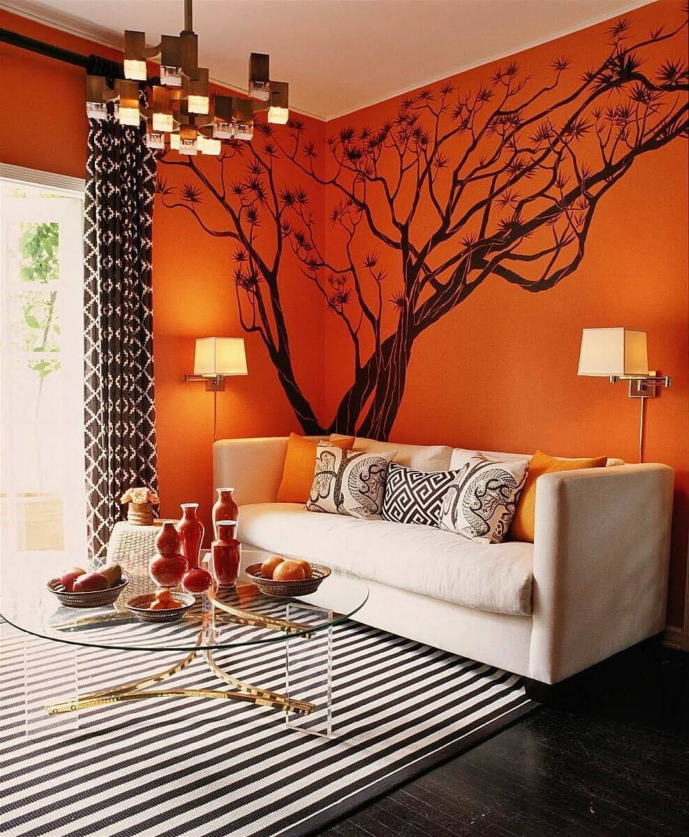Если акцентной деталью вы решили сделать настенное покрытие, то, прежде всего, стоит определиться со стилем, в котором будет выполнен дизайн комнаты, а также мебельные конструкции в комнате выбирать в спокойных, не контрастирующих с обоями тонах. При желании добавить в дизайн гостиной уюта следует использовать более приглушённые, бледные оттенки. Лучше всего сочетать подобные оттенки с коричневым, бежевым и молочным. Существует несколько стилей оформления помещения, в которых оранжевый смотрится уместно во многих случаях: классический, минимализм и ампир.