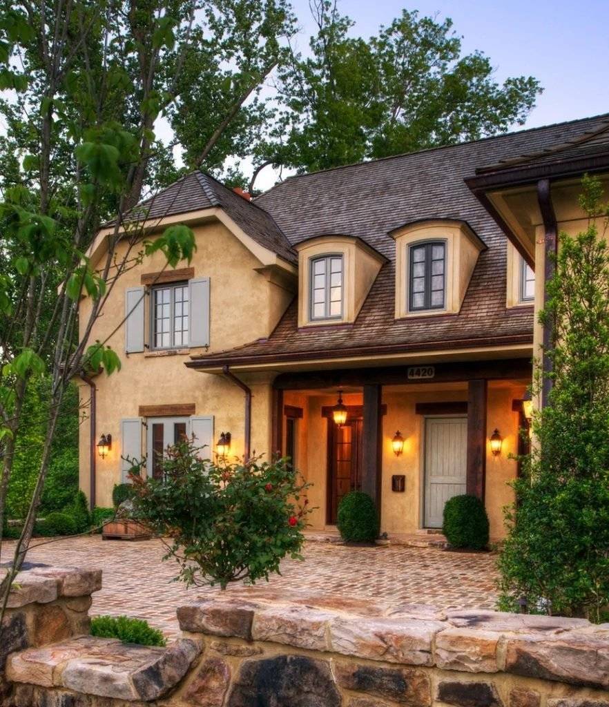 Полноценный фасад провинциального домика на одну третью покрывает полоска вьющегося растения, на нем есть ставни, подоконники с цветочниками и многосекционные окна, в идеале из дерева. В отделке используют камень и древесину, а современные и искусственные материалы не применяют вовсе. Все элементы высоких технологий надежно прячут.
