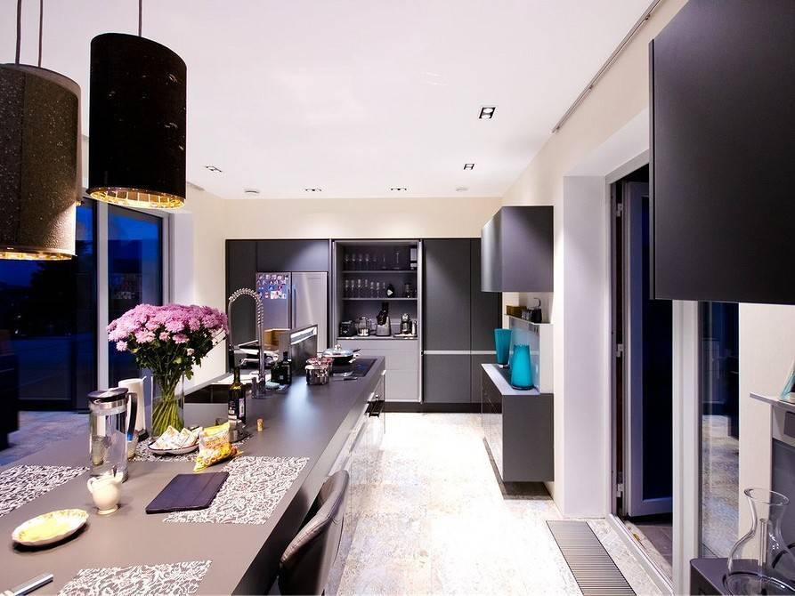 12. Поперечно направленный свет зрительно расширяет узкую кухню. Если потолок ниже 3 метров, люстру стоит заменить более эргономичными точечными светильниками.