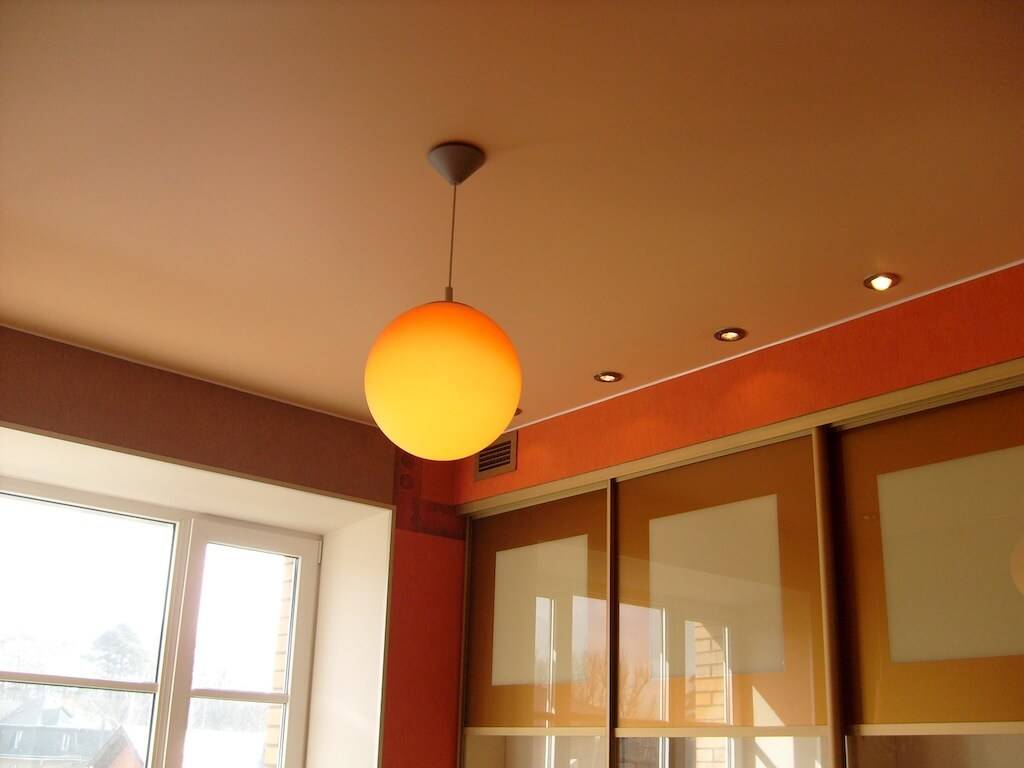 10. Подбор светильника зависит от фактуры потолка. Матовая ПВХ-поверхность гармонично сочетается с закрытыми люстрами.