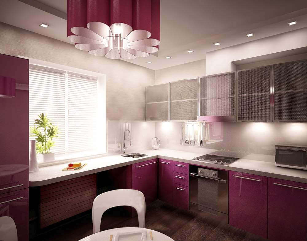 11. Многорожковая люстра с плафонами на глянцевом потолке выглядит интересно. Однако есть существенный минус: обладателям этой кухни придется тщательно следить за чистотой. Каждая пылинка-паутинка будут удвоены отражением.