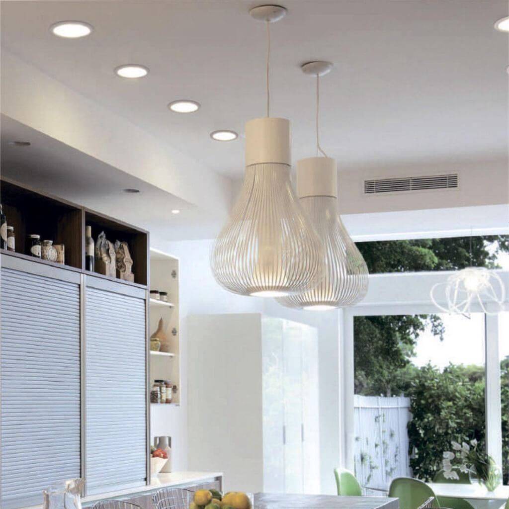 Без общего света на кухне не обойтись, но от централизованного источника света лучше отказаться в пользу нескольких встроенных или накладных светильников, которые дадут более равномерный свет.