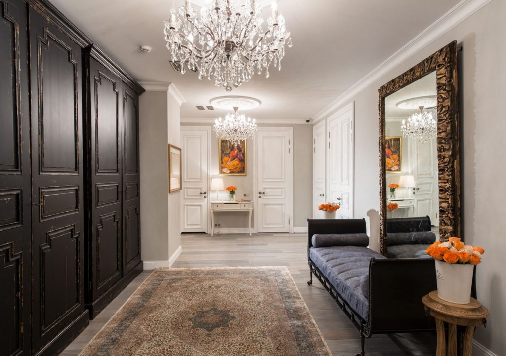 - Классицизм — это коричневые и песочные бра, отделанные позолотой, кованая хрустальная люстра. И здесь размеры прихожей играют решающее значение. Такое решение возможно в холле.