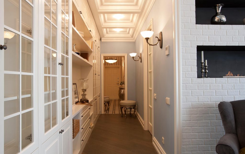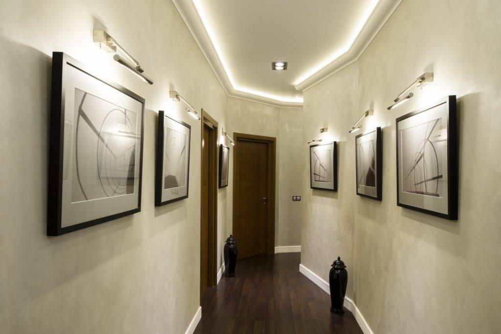 На подвесных, натяжных потолках, в плинтусах устанавливают точечные источники света. Количество и схема расположения зависят от размеров коридора.