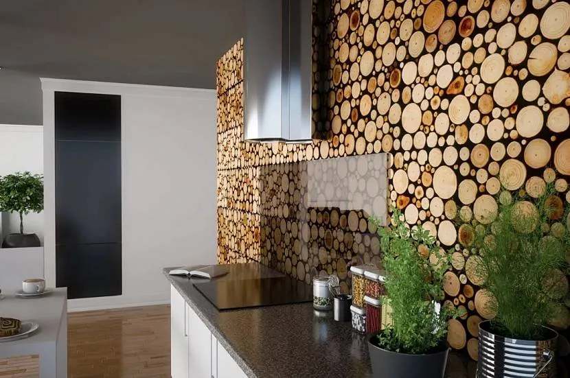 Интересным и непривычным будет отделка деревом кухонного фартука. Чтобы дерево меньше подвергалась негативному воздействию влаги, загрязнений и высоки температур, его можно закрыть прозрачным стеклянным листом – скинали.