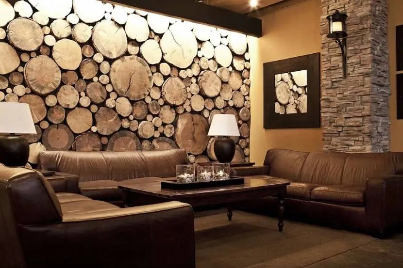 Иногда для оформления интерьера используют спилы и торцы. В этом случае нужно подумать, чем заполнить основную площадь стен, ведь декоративные элементы составят лишь ее часть