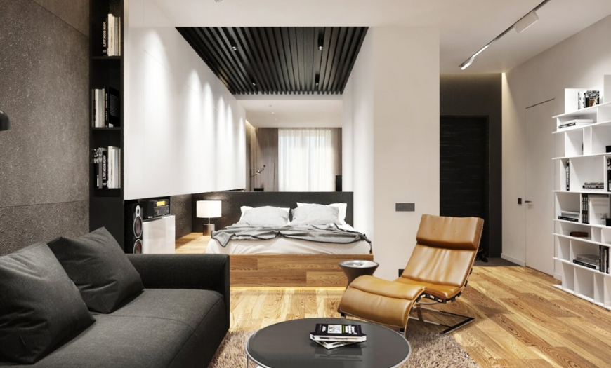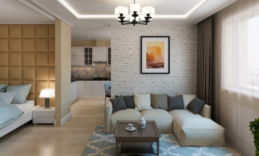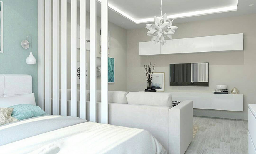 Для экономии места в спальне-гостиной можно использовать диван-кровать или кровать-трансформер, которая убирается в шкаф. В этом случае зонирование не понадобится — в дневное время комната будет выполнять роль зала, в вечернее — спальни.
