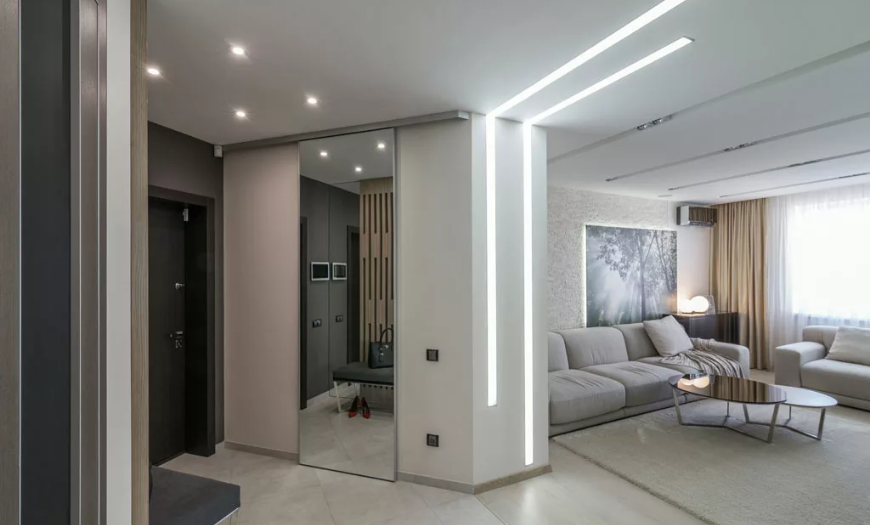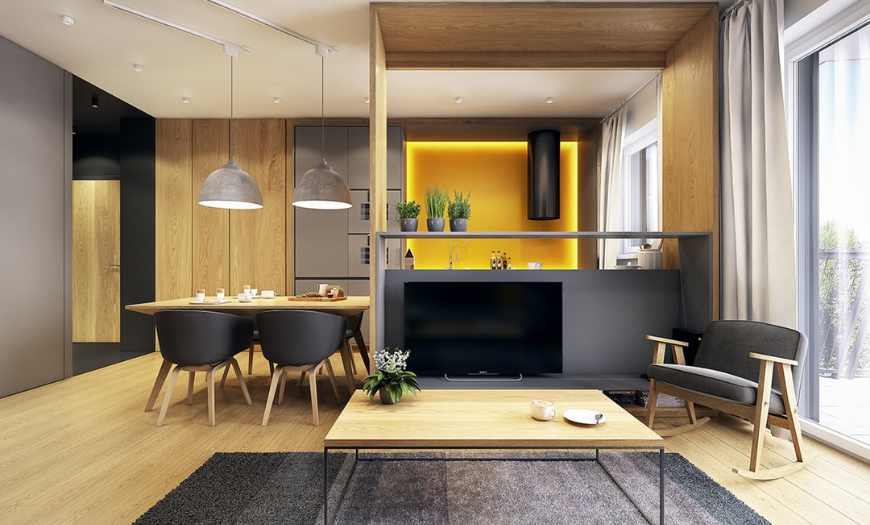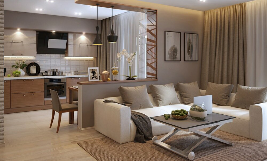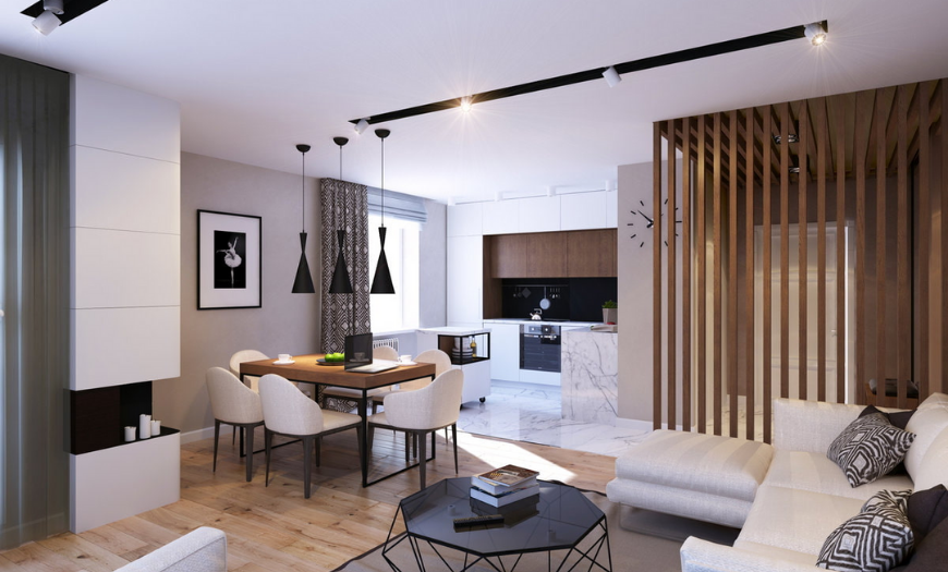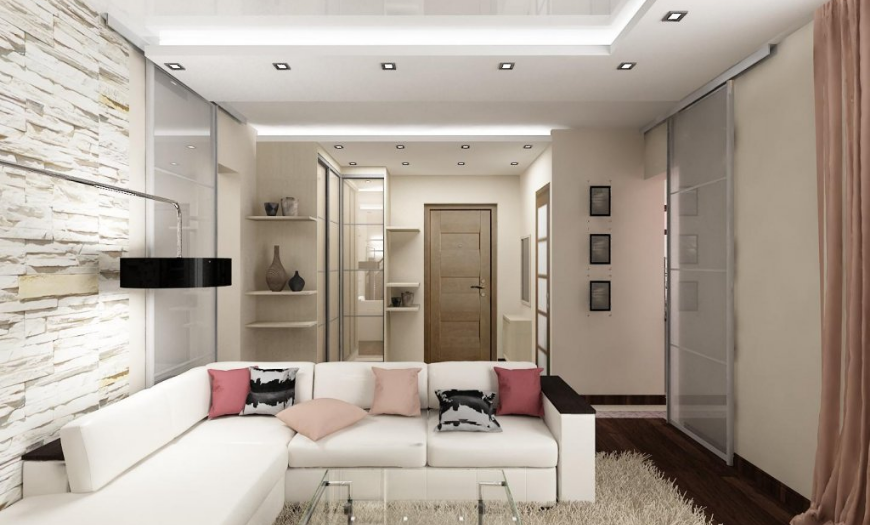 Если площадь вашей квартиры или дома достаточно большая, можно выделить гостиную в качестве отдельного помещения. В противном случае зал можно объединить с кухней, спальней или прихожей. Такие дизайнерские решения часто встречаются в современных интерьерах, т.к. объединенное пространство становится больше и функциональнее.