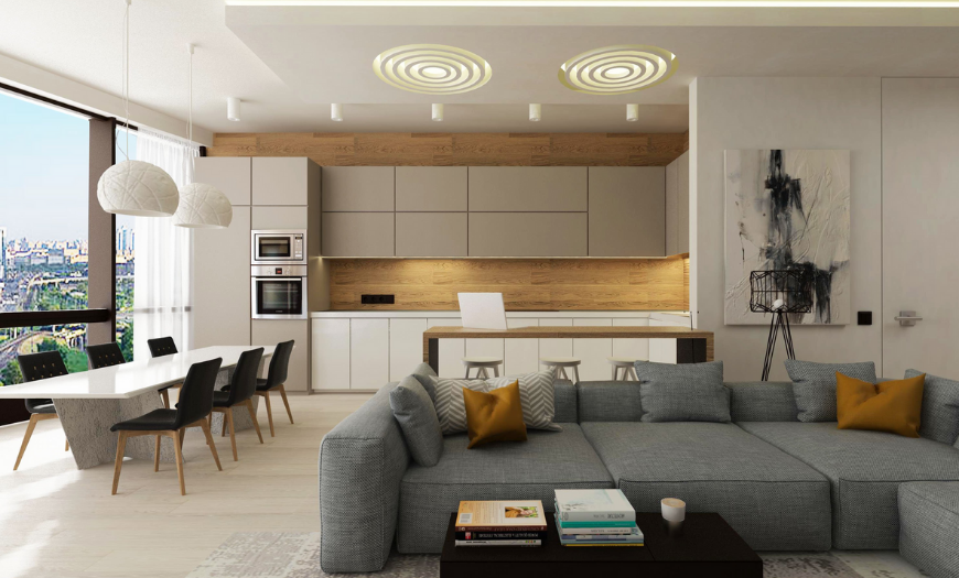 Современный стиль предусматривает множество вариантов для совмещения кухни и гостиной как с зонированием, так и без, в зависимости от площади помещения и назначения. Разграничить пространство между зоной приготовления пищи и отдыха можно и с помощью дивана, поставив его “спиной” к кухонному гарнитуру, или большого аквариума с подсветкой.