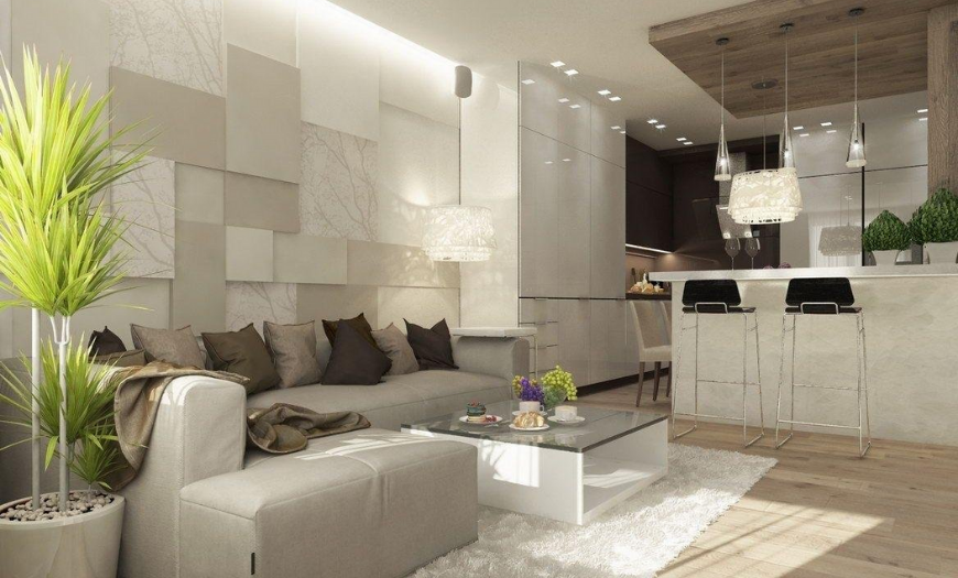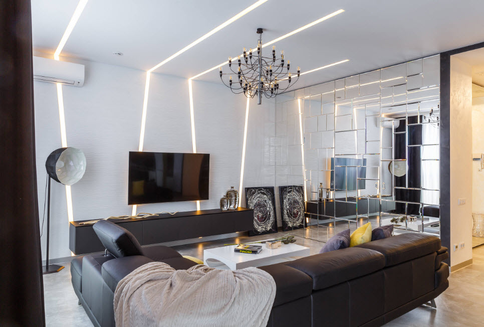Современное направление является наиболее подходящим для интерьера небольшого помещения. Модерн, хай-тек и минимализм полностью меняют визуальное восприятие зала. Качественные отделочные материалы, металлические и стеклянные поверхности хорошо сочетаются с простой меблировкой и ультрасовременной техникой, создавая гармоничную композицию.