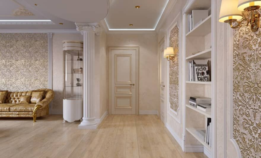 Зал в стиле классика отделывают натуральными материалами такими, как мрамор, камень или дерево, используют дорогой текстиль и кованые детали.
