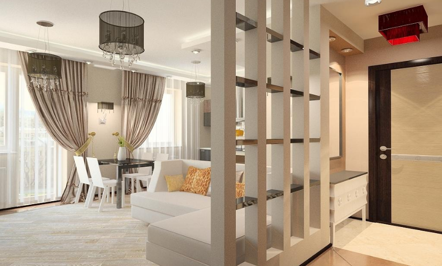 Совмещать прихожую и гостиную приходится, когда последняя является проходной комнатой. Для того чтобы зал стал более приватным, можно, например, поставить раздвижную перегородку или разграничить помещения с помощью комода. Большую роль для визуального отделения одного пространства от другого играют аксессуары — картины, фотографии.
