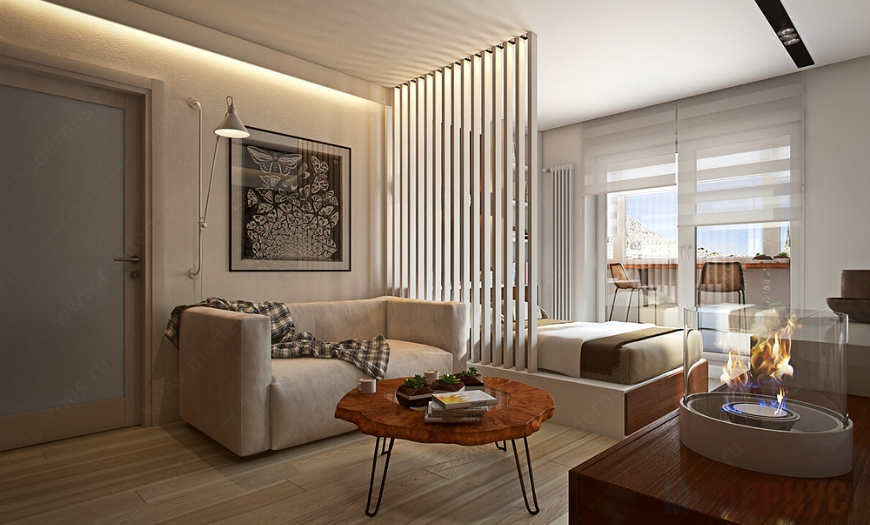 На фото стиль минимализм в интерьере зала площадью 18 квадратов.