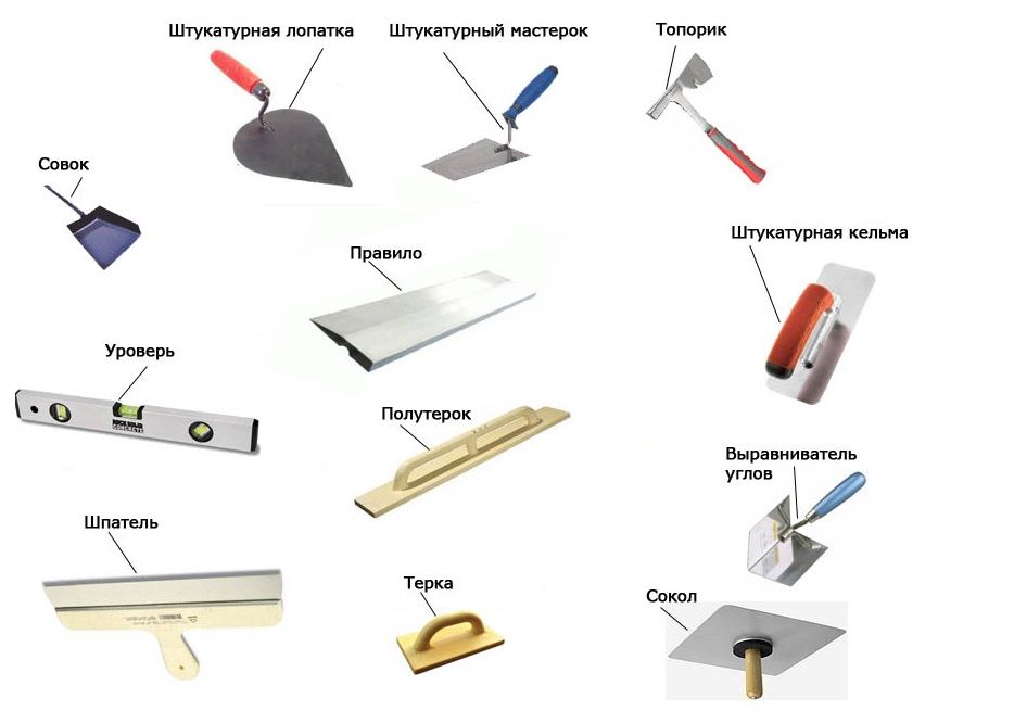 - Инструменты для нанесения готовой смеси на стены: шпатель (5-сантиметровый), мастерок (каким пользуются каменщики), полутерок и терки (если планируется штукатурить смесями на основе цемента). Если планируется применять сесь на гипсовой основе, вместо полутерка и терок будут нужны широкий шпатель (45-сантиметровый), гладилка и терка с губчатой основой.