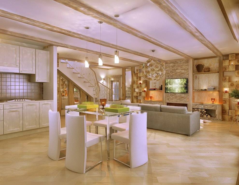 Кантри или лофт — удачное дополнение к деревянным потолочным балкам и колоннам.