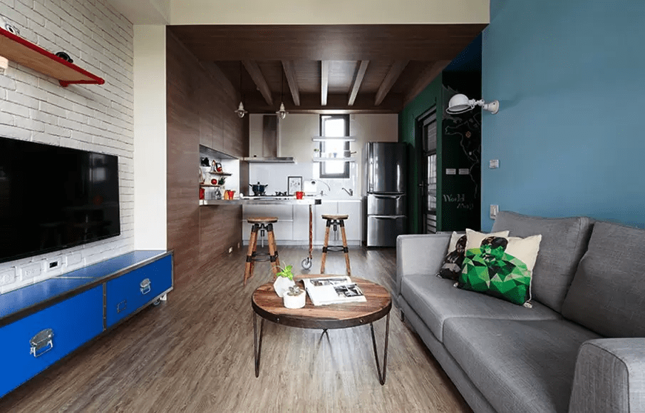 Интерьеру в индустриальном стиле соответствует определённый набор цветов. Основой для цветовой палитры являются оттенки серого с небольшим вкраплением чёрного цвета.
