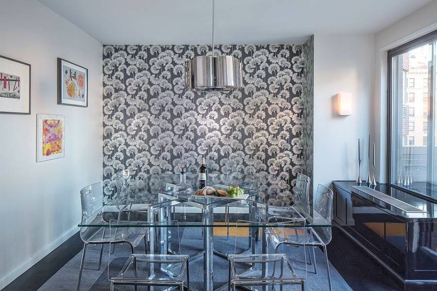 Обеденную зону желательно выделять от рабочей, не нарушая общую стилистику. Материалы использовать такие, которые не пачкаются или легко моются. Хотя при желании отделка может быть любая: декоративная штукатурка, текстиль, кирпич, виниловые, моющиеся и фотообои, деревянная вагонка, зеркальная плитка, окрашенная поверхность. Интересно обособит столовую зону отделка стены с заходом на потолок. Цвет может быть темнее или светлее основного тона, заданного в интерьере. Реже зону делают акцентной, выбирают совершенно другой сочетаемый цвет.