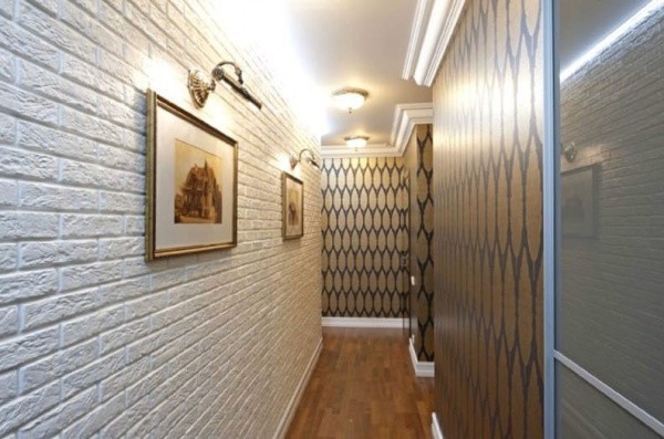 На фото узкий коридор со стенами, облицованными кирпичом белого цвета.