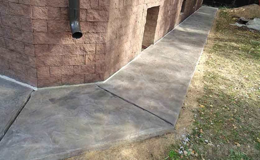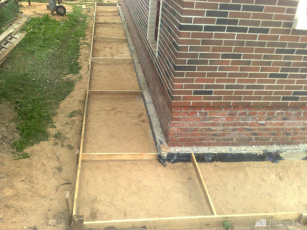 Чтобы залить отмостку вокруг дома, применяется технология, сходная с обустройством дорожек, но только под уклоном.