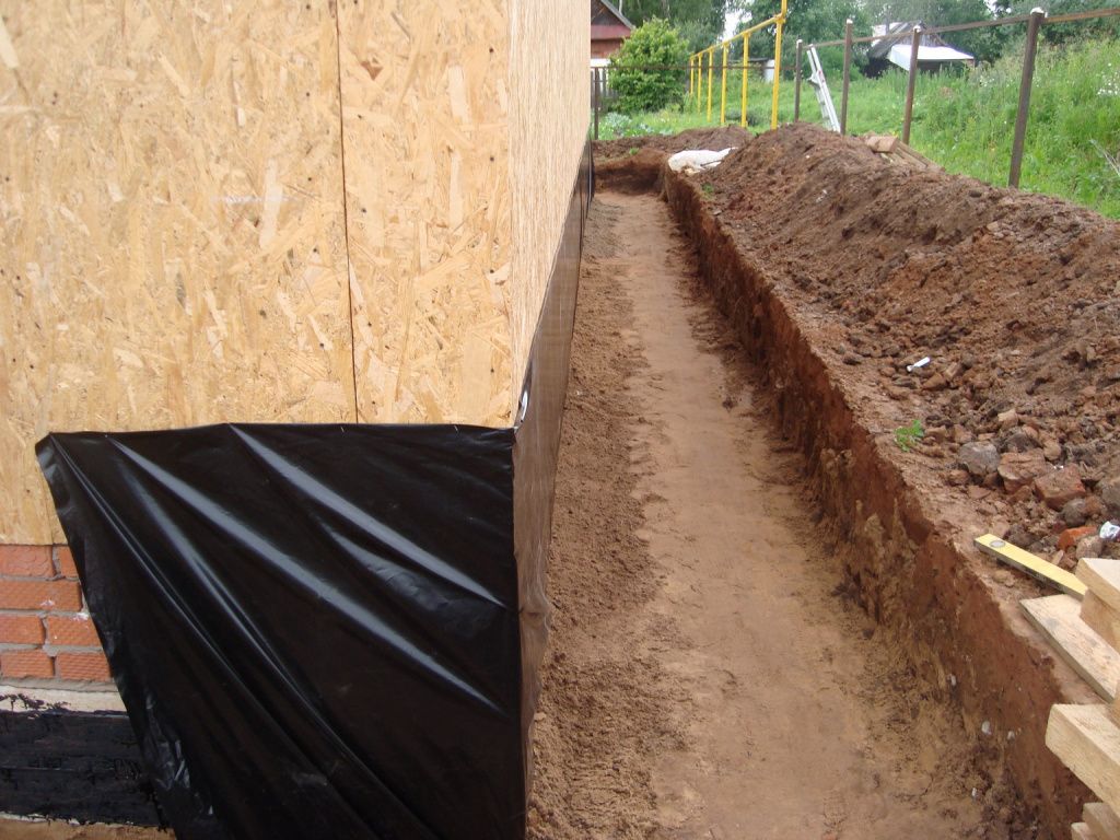 - Защита фундамента от воды. Именно влага оказывает наибольшее пагубное воздействие на опору здания. Если не выполнить работы по защите основания, то постепенно произойдет разрушение и деформация, что может привести к полной утрате несущих свойств. Для этого по периметру здания устраивается поднятый над землей уклон, который удаляет или задерживает на расстоянии излишки влаги, появляющиеся в результате выпадения атмосферных осадков или деятельности человека.