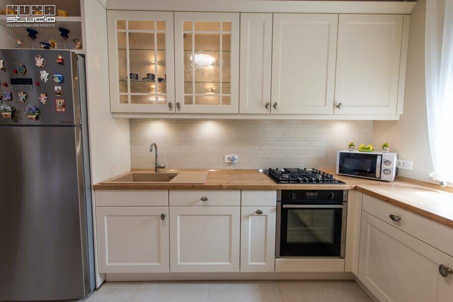 Это удачное решение, если кухня небольшая и вы хотите, чтобы мебель не загромождала пространство. Лучше всего подойдут светлые тона — разные оттенки белого, бежевого, кремового. Расставить акценты на маленькой П-образной кухне помогут фартук над рабочей зоной, столешница, бытовая техника, текстиль и аксессуары — интерьер не будет скучным.