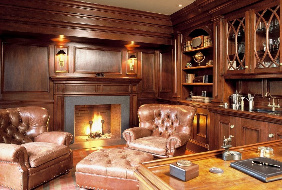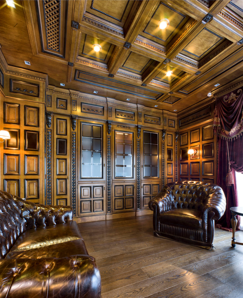 Деревянные буазери в домашнем кабинете с резной мебелью, картинами в золотых рамках и раритетным камином